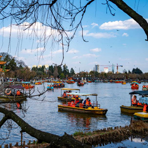 2月16日,游客在大观公园里划船。