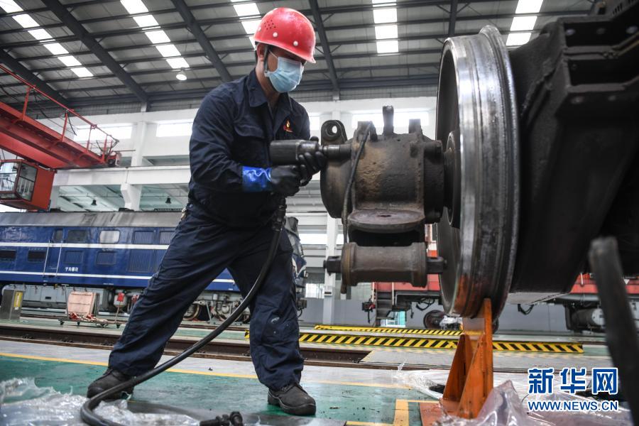 2月16日,在柳州机务段检修库,一名“落轮工”在拆卸机车齿轮箱。