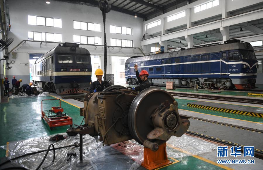 2月16日,在柳州机务段检修库,“落轮工”在维修机车齿轮箱。