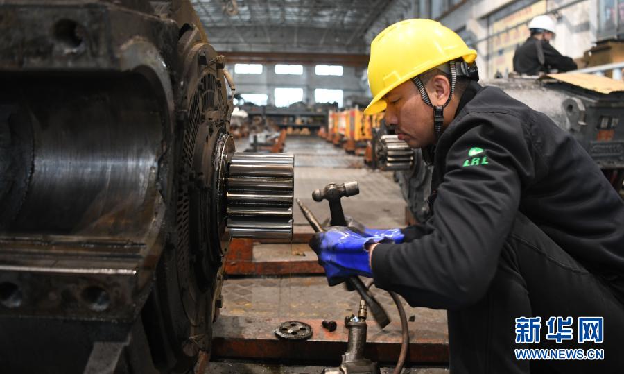 2月16日,在柳州机务段检修库,一名“落轮工”在维修电机齿轮。
