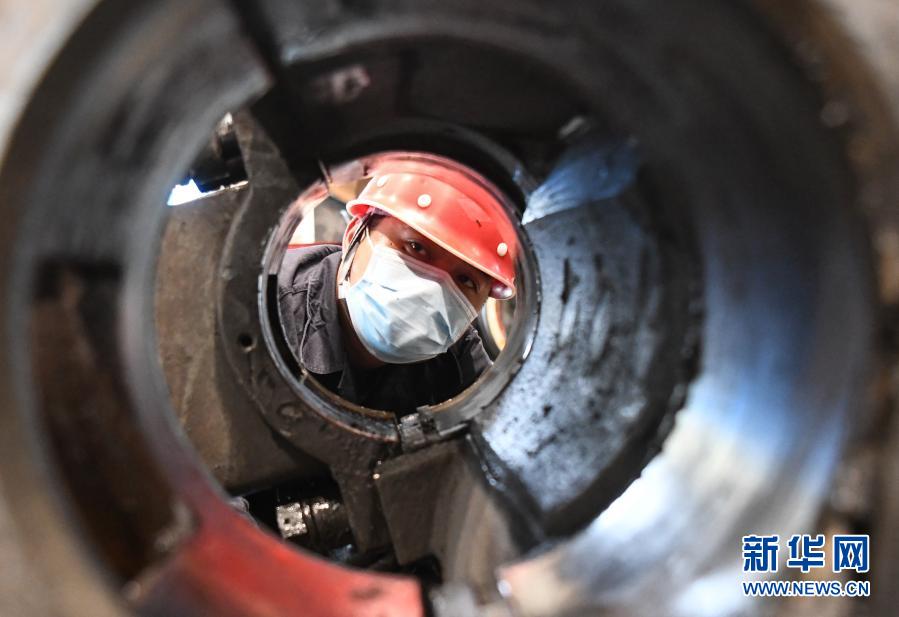 2月16日,在柳州机务段检修库,一名“落轮工”在检查电机基孔的平整度。
