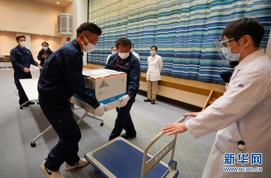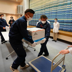 2月16日,工作人员在日本东京的一所医院内搬运疫苗。
