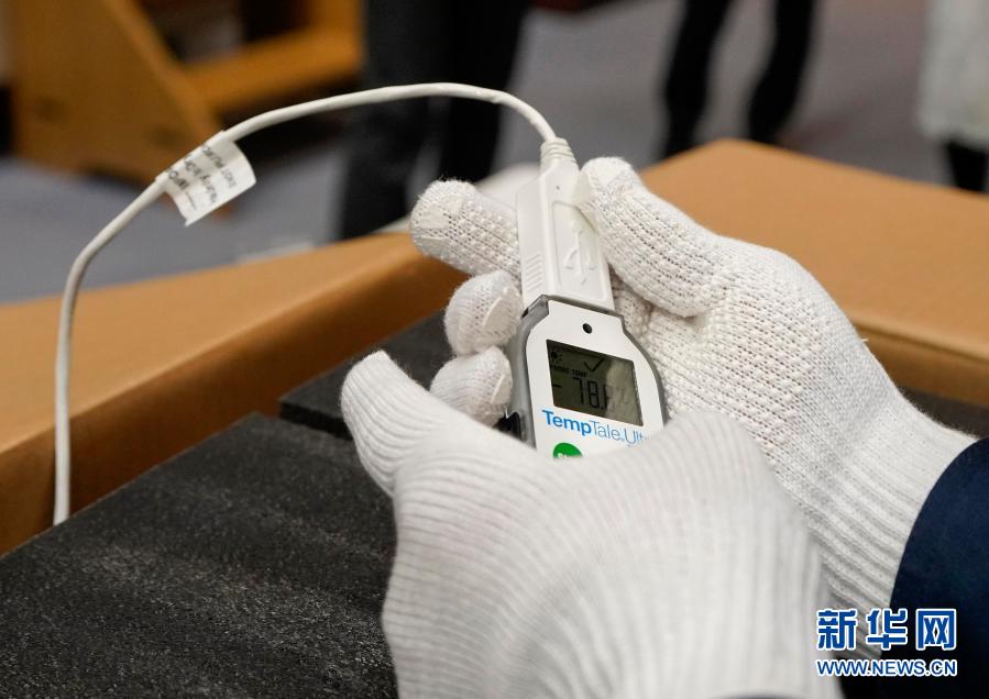 2月16日,工作人员在日本东京的一所医院内递交疫苗时测量温度。