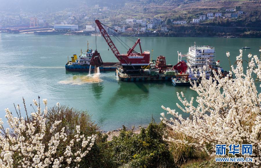 2月16日,施工船舶在三峡大坝下游莲沱水域进行施工作业(无人机照片)。