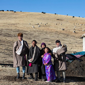 在红原县阿木乡卡口村,向巴(左二)一家在牧场暖棚外合影(2月15日摄)。