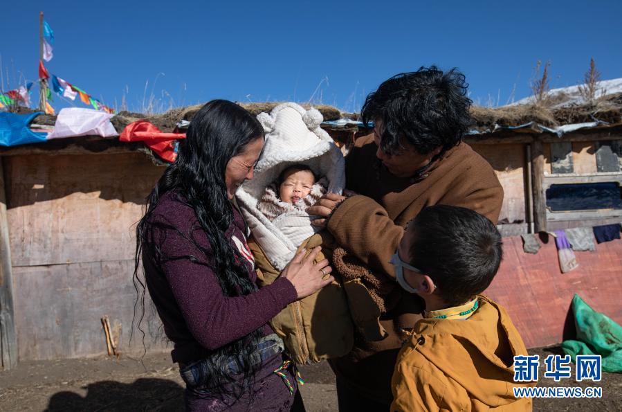 在红原县阿木乡卡口村,顿炯(右二)和妻子央青卓玛(左一)、儿子甲央贡嘎顿增、不足一个月大的女儿在牧场暖棚前(2月15日摄)。新华社记者 江宏景 摄