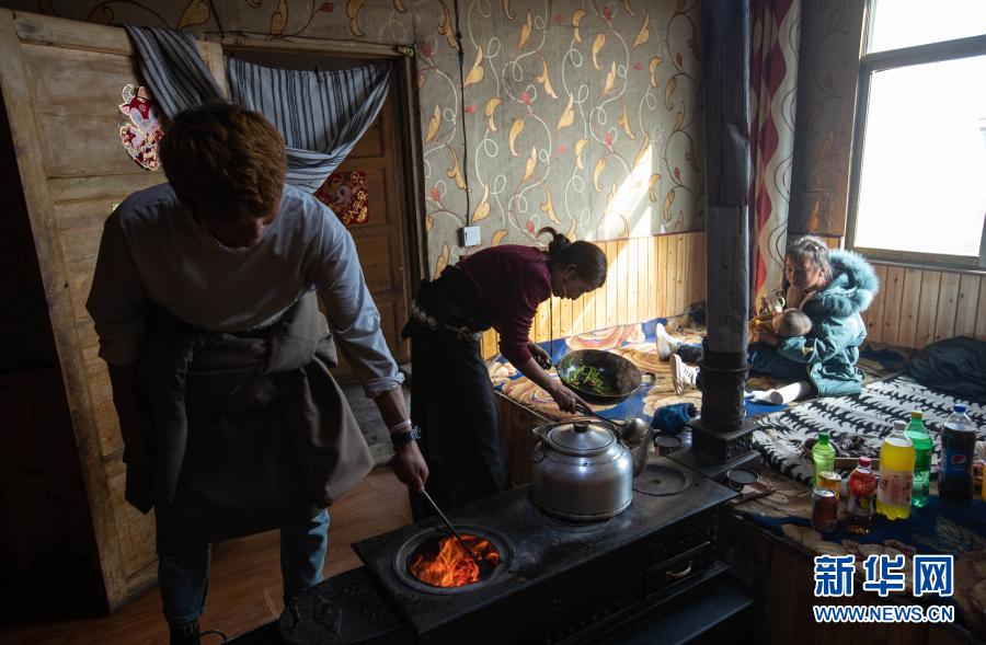 在若尔盖县黑河牧场,益西旦真和妻子纳么措在暖棚里做饭炒菜(2月15日摄)。新华社记者 江宏景 摄