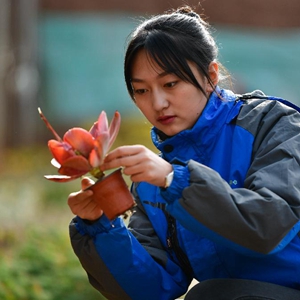 在青海省海东市平安区平安镇白家村富硒果蔬种植基地的大棚里,韩颖在查看多肉植物(2月8日摄)。新华社记者 张龙 摄