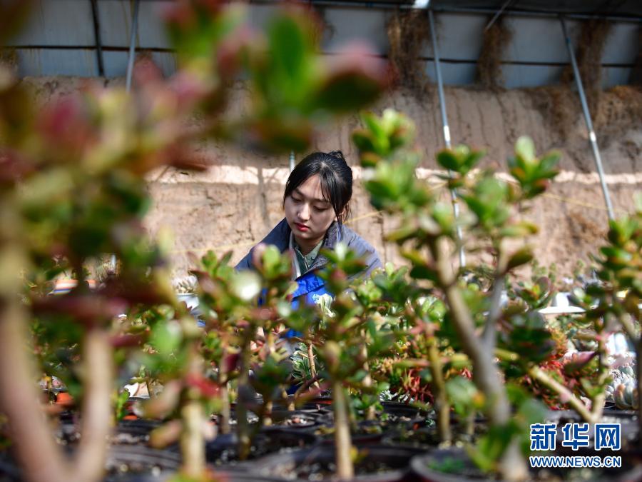 在青海省海东市平安区平安镇白家村富硒果蔬种植基地的大棚里,韩颖在查看多肉植物(2月8日摄)。新华社记者 张龙 摄