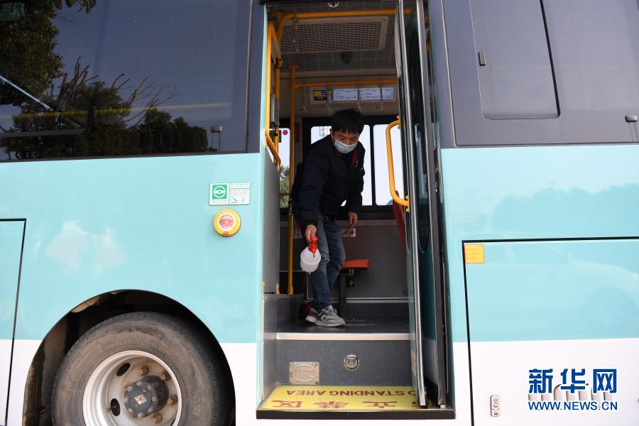 2月17日,胡春在花岗枢纽站为公交车消毒。新华社记者 刘军喜 摄