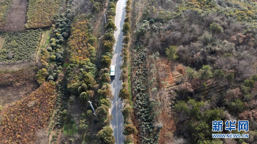 2月17日,胡春驾驶公交车行驶在肥西县花岗镇的乡村公路上(无人机照片)。新华社记者 刘军喜 摄