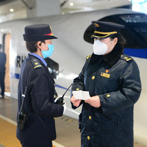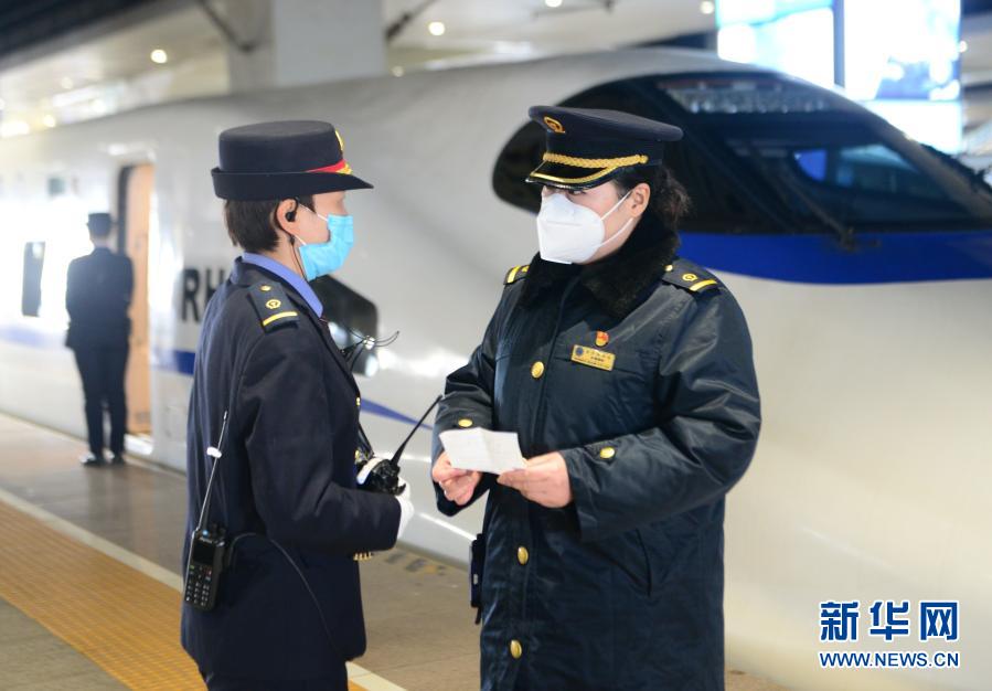 2月17日,在石家庄站站台,工作人员进行工作交接。