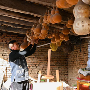 曹光耀在位于霍尔果斯市加尔苏村的家中挑选葫芦(2月6日摄)。新华社记者 丁磊 摄