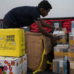 2月8日,斯里兰卡科伦坡一家当地跨境转运公司的雇员整理春节前从中国收到的一批货物。新华社记者 唐璐 摄