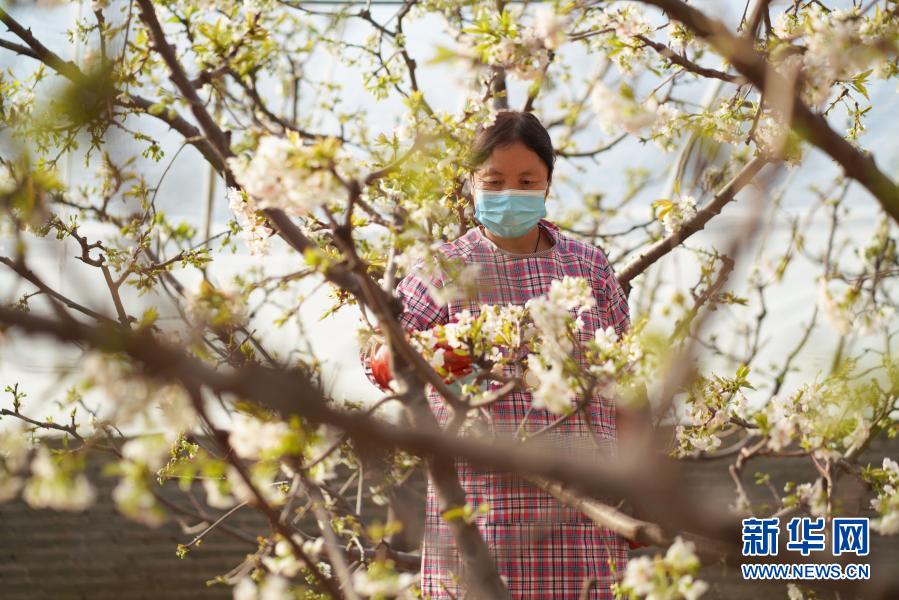 2月18日,河北省邢台市内丘县金店镇小辛旺村的果农在大棚里为樱桃花进行人工授粉。