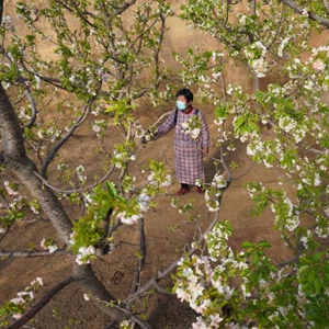 河北省邢台市内丘县金店镇小辛旺村的大棚樱桃正值盛花期,果农们忙着为樱桃花进行人工授粉,确保大棚樱桃丰产丰收。