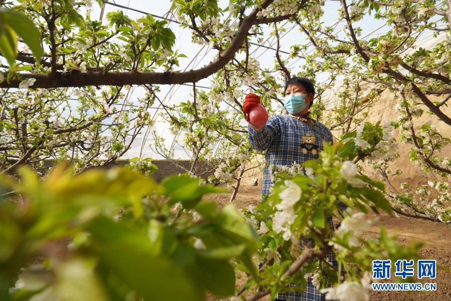 河北省邢台市内丘县金店镇小辛旺村的大棚樱桃正值盛花期,果农们忙着为樱桃花进行人工授粉,确保大棚樱桃丰产丰收。