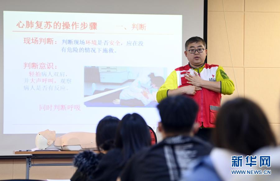 2月18日,天津市红十字应急救援队队长潘森在和平区津湾广场为参训人员授课。新华社记者李然摄