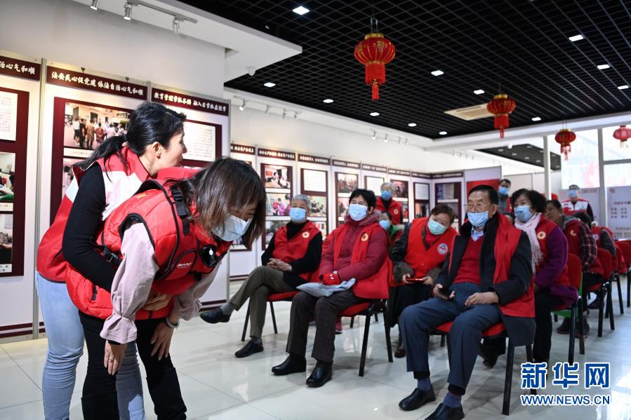 2月18日,天津市和平区红十字会工作人员张霞(前左一)在庆有西里社区为参训人员示范急救动作。新华社记者李然摄