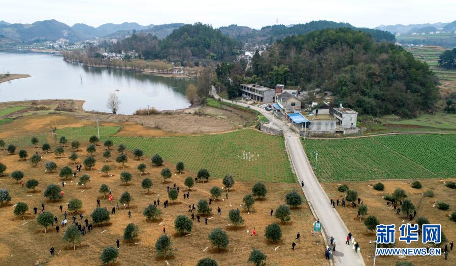 2月18日,人们在贵州省毕节市黔西县绿化乡大海子村参加义务植树(无人机照片)。