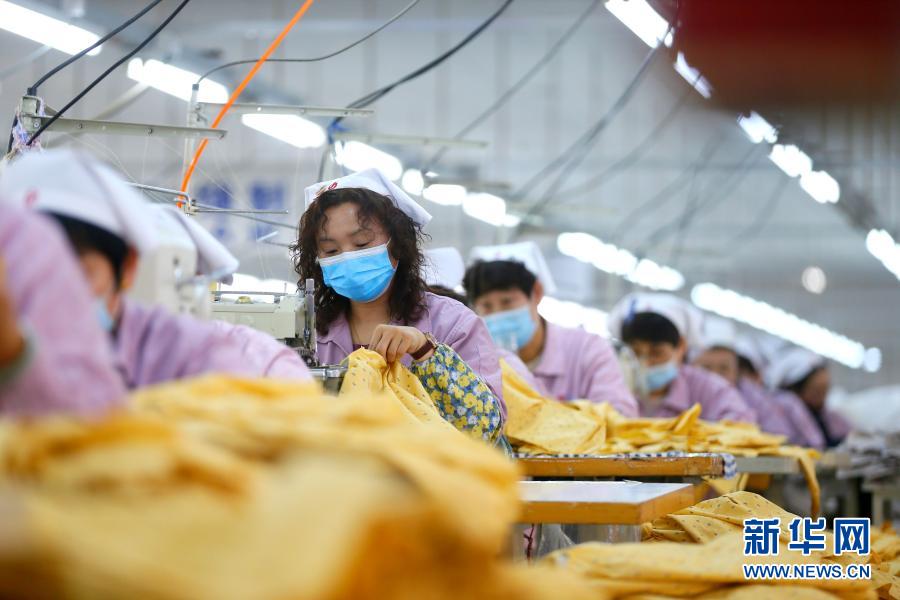 2月18日,山东省青岛市即墨区即发集团有限公司的缝纫工人生产出口到海外的服装产品。新华社发(梁孝鹏 摄)