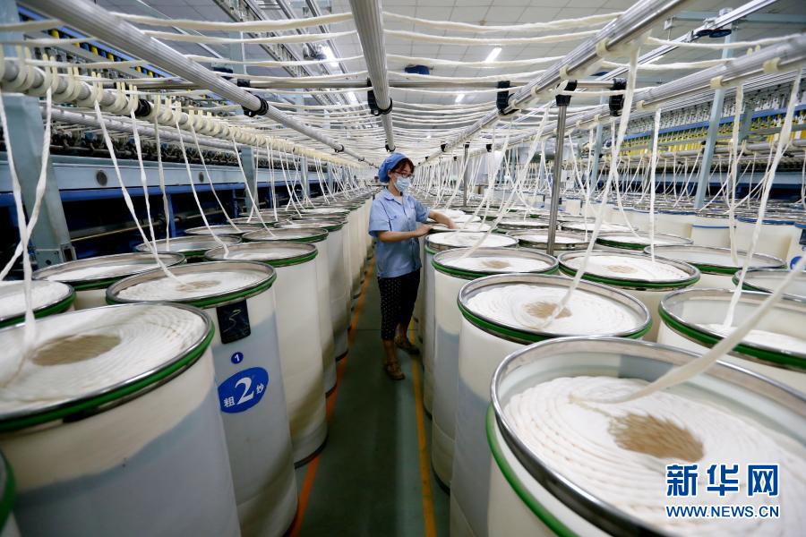 2月18日,在位于山东省青岛市即墨区龙山街道的一家纺织企业,工人生产棉纱产品。新华社发(梁孝鹏 摄)