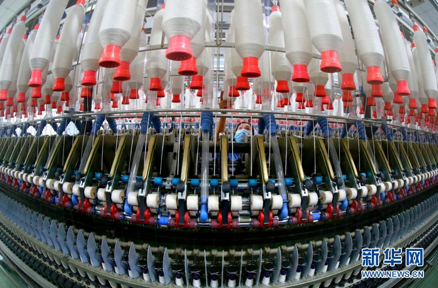 2月18日,在位于山东省青岛市即墨区龙山街道的一家纺织企业,工人生产棉纱产品。新华社发(梁孝鹏 摄)