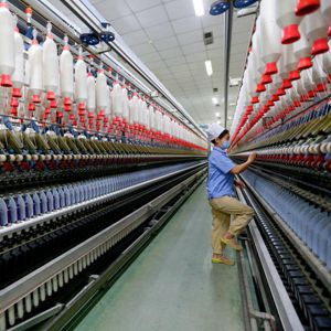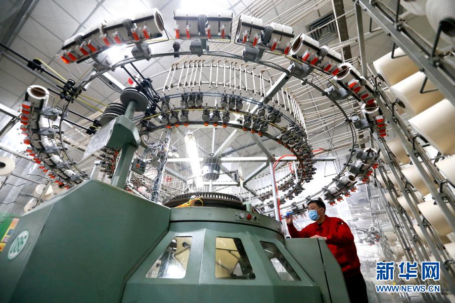 2月18日,山东省青岛市即墨区即发集团有限公司的纬编工人在生产线上忙碌。新华社发(梁孝鹏 摄)