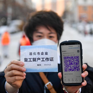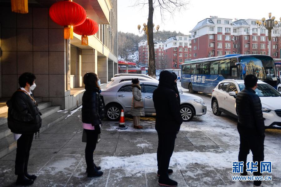 鲁春梅(左一)和同事等候班车(2月16日摄)。