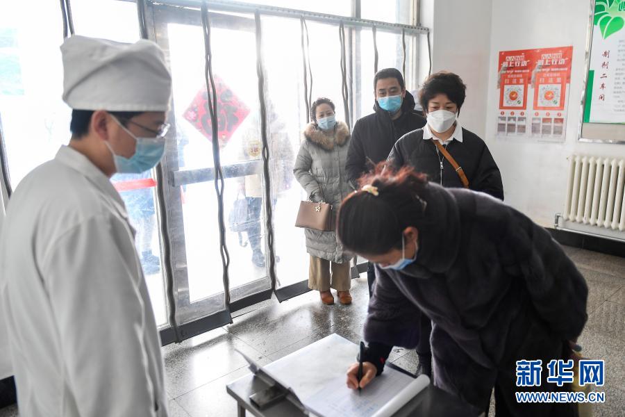 鲁春梅和同事进入生产车间前在门口处测量体温并进行信息登记(2月16日摄)。