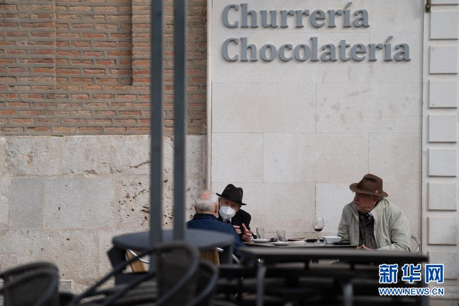 2月17日,顾客在西班牙瓜达拉哈拉一家餐馆外用餐、聊天。新华社记者 孟鼎博 摄