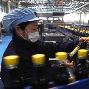 2月18日,在江苏省镇江市,工人在一家食醋酿造企业的灌装生产线上检查产品。