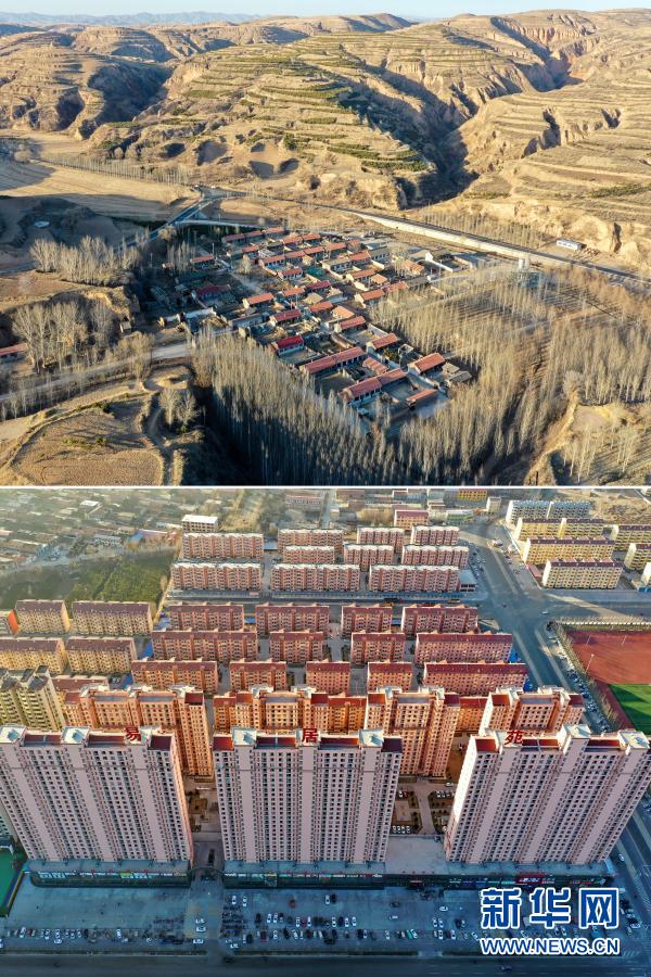 拼版照片的上图为刘志平一家人过去居住的岚县顺会乡舍安村(2月3日摄,无人机照片);下图为刘志平一家人现在居住的位于岚县城区的易居苑社区(1月8日摄,无人机照片)。