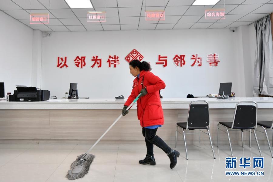 刘志平在岚县易居苑社区内打扫卫生(1月6日摄)。