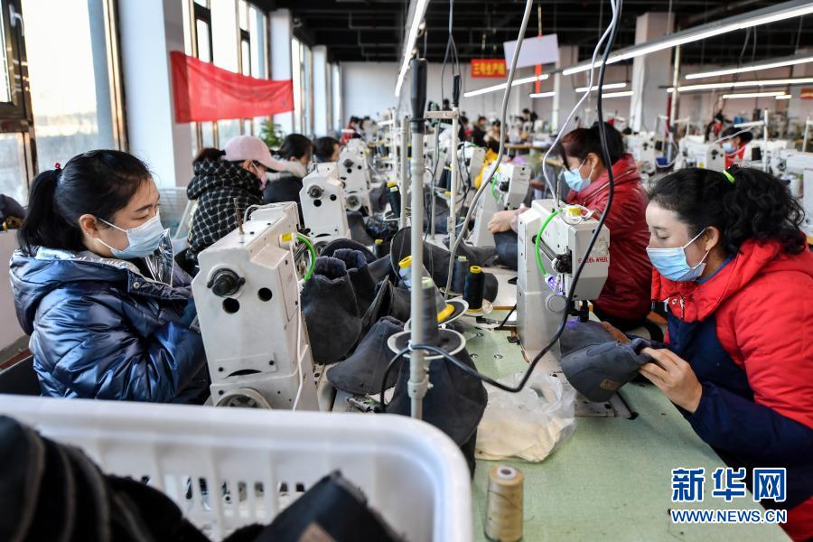 刘志平(前右)在位于岚县易居苑社区的扶贫工厂内工作(1月8日摄)。