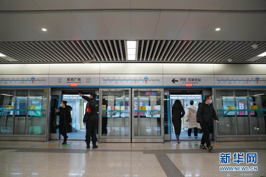 2月19日,乘客在石家庄地铁新百广场站上下车。