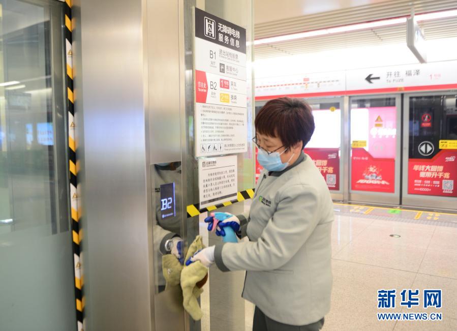 2月19日,在石家庄地铁1号线北国商城站站台,工作人员对电梯按键进行清洁。