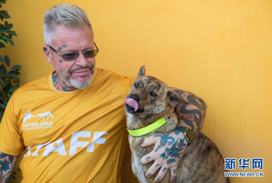 2月16日,瑞典人迈克尔在泰国春武里府的“流浪狗救助者”收容所和收容的流浪狗互动。