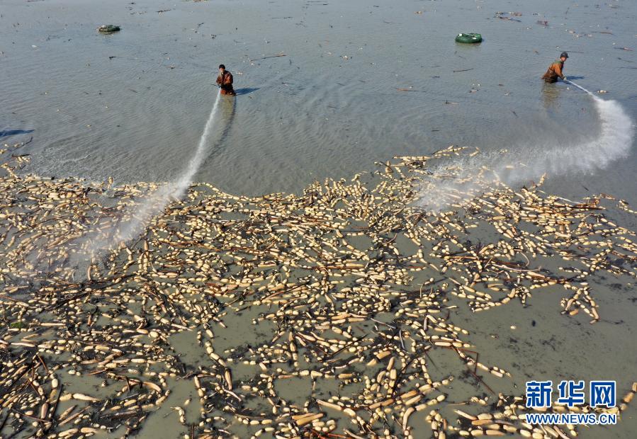 2月19日,安徽省全椒县十字镇农民在藕田里劳作(无人机照片)。