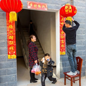 在河南省新乡市封丘县李庄镇前辛庄社区,杜英慧(前左)从社区超市买菜回来,丈夫(右)在楼下挂灯笼(2月11日摄)。新华社发(孙庆军 摄)