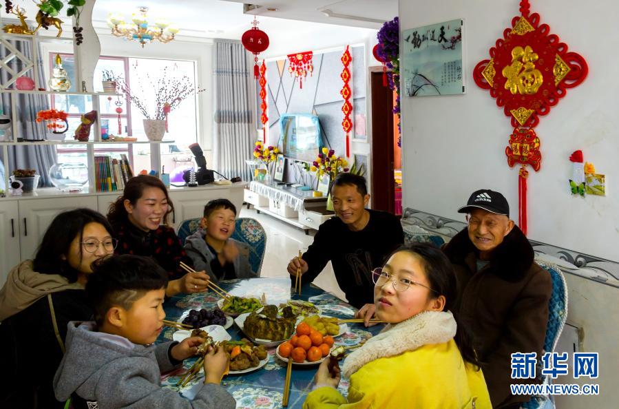 在河南省新乡市封丘县李庄镇前辛庄社区,杜英慧一家在吃午饭(2月11日摄)。新华社发(孙庆军 摄)