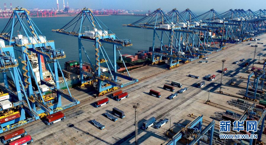 2月19日,在位于山东自贸试验区青岛片区的山东港口青岛港全自动化码头,自动导引车在工作中(无人机照片)。新华社发(张进刚 摄)