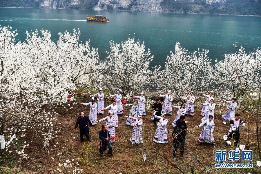 2月19日,苗族村民在贵州省黔西县新仁苗族乡化屋村的樱桃林下表演苗族舞蹈。