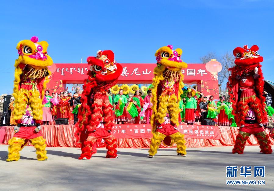 2月19日,在呼和浩特市回民区莫尼山非遗小镇,民间艺人表演舞狮。
