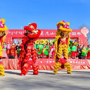 2月19日,在呼和浩特市回民区莫尼山非遗小镇,民间艺人表演舞狮。新华社发(王正 摄)