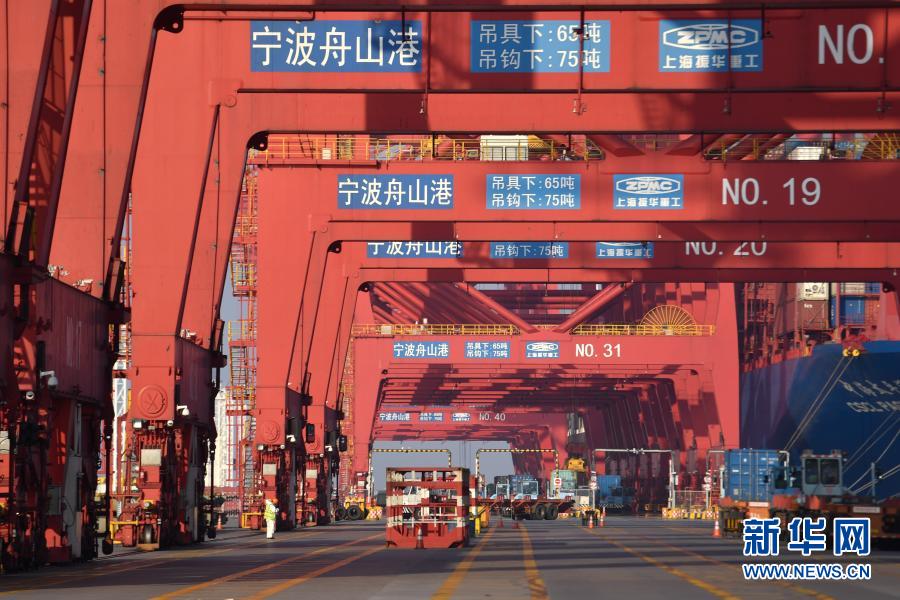2月19日,卡车在宁波舟山港梅东码头准备装运。