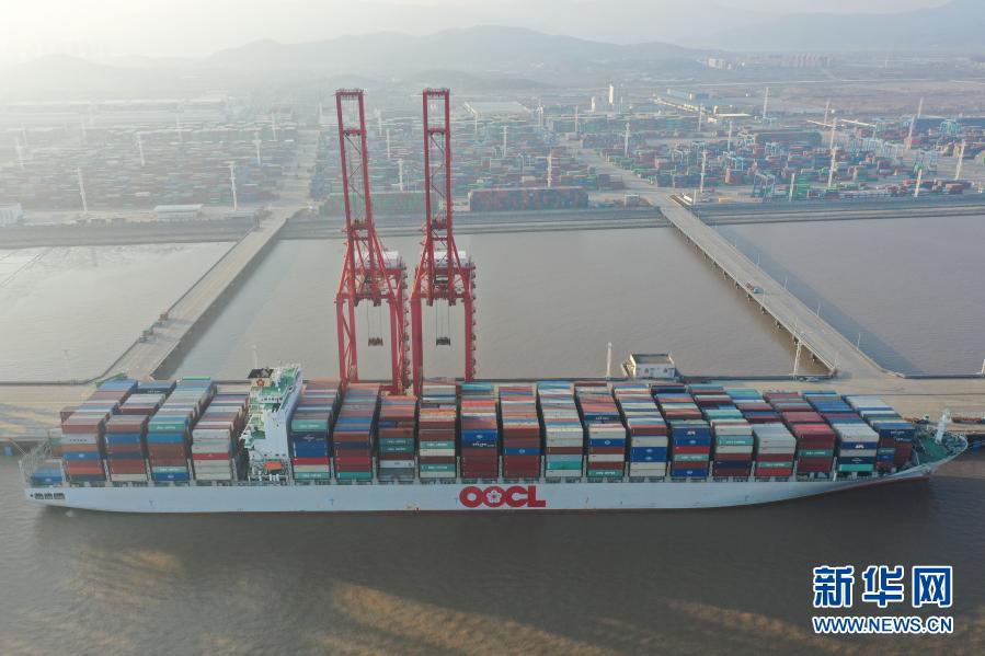 2月19日,一艘货轮停靠在宁波舟山港梅东码头(无人机照片)。