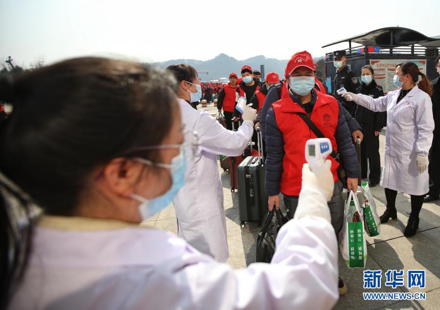 2月20日,务工人员在三穗站外测量体温。