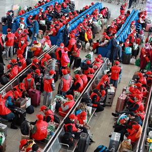 当日,500余名贵州省黔东南苗族侗族自治州锦屏县务工人员在三穗站搭乘2021年贵州首趟务工专列G2336次列车前往浙江义乌。