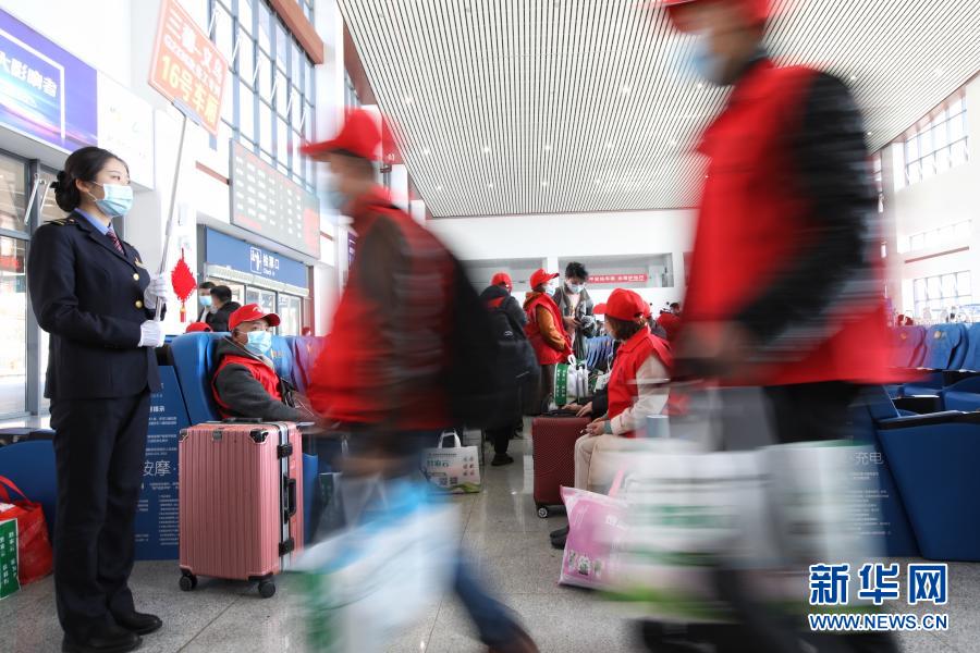 当日,500余名贵州省黔东南苗族侗族自治州锦屏县务工人员在三穗站搭乘2021年贵州首趟务工专列G2336次列车前往浙江义乌。